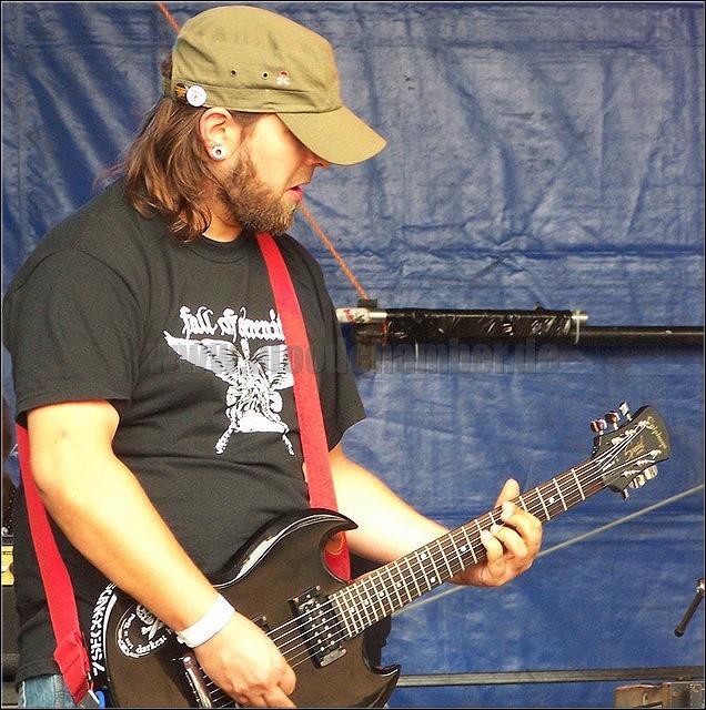 Mit FALL OF SERENITY steht danach sogar eine waschechte Metal-Kapelle auf den Brettern. Zwar trauen sich anfangs noch nicht allzu viele Leute aus ihrem Versteck, doch unmittelbar vor der Bühne gibt es ein trockenes Plätzchen und zudem richtig guten Melodic Death, was immer mehr Tanz- und Bangwütige anlockt. Die Thüringer Band hat in diesem Jahr schon Bühnen hinter den sieben Bergen beackert und ist dementsprechend routiniert, doch mit einer großen Schippe Spielfreude bei der Sache. Fronter René ist ein echtes Entertainment-Talent und mag es zudem, ausgiebig mit seinen Mitstreitern und auch den in der ersten Reihe stehenden Bangern (gell, Pick?) zu schmusen. „...und jetzt dürft ihr unseren Schlagzeuger bewerfen“, bemerkt er lapidar am Ende der Show. War wohl doch zu gut, als dass jemand Lust dazu hätte.