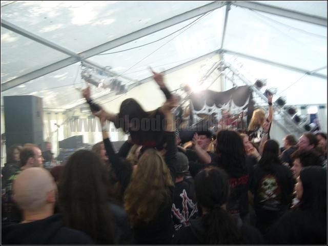 Amüsant sind LAY DOWN ROTTEN dann lediglich in den Zwischenansagen, ansonsten wird standesgemäß alles ausgebombt, was auch nur ansatzweise wagt, dem Soundorkan entgegen zu treten. Im ausgewogenen Set der Wessis findet sich dabei nicht nur der Titeltrack der letzten Scheiblette „Reconquering The Pit“, sondern auch hochkalibrige Abrissbirnen von älteren Scheiben wie „Bleeding Insanity“ oder dem Erstling, die allesamt sehr agil dargeboten werden.