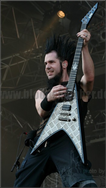 Frisch mit Sonnenmilch eingeschmiert, konnte ich bei DEADLOCK um 15.10 Uhr schön beobachten, wie das Zeug in der glühenden Sonne von meiner Haut verdampfte. Sonne ist ein Arschloch, aber DEADLOCK sind für mich Pflicht. In der Umbaupause musste man sich schon Sorgen machen. Maximal 20 Leute standen vor der Bühne, aber pünktlich zum Intro, das von der Ankündigung der Band durch eine Sprecherin zum Eurodance übergeht, bei dem Schlagzeuger Tobias das Publikum dirigiert, krochen sie aus allen Verstecken vor der Sonne wieder hervor, um die Band abzufeiern. Es folgte einer der besseren Auftritte von DEADLOCK, denn dieses Mal stimmt der Sound, was bei der Regensburger/Leipziger Formation nicht allzu regelmäßig vorkommt. So fraßen ihnen die jüngeren Zuschauer aus der Hand, die älteren standen eher weiter hinten und guckten interessiert, wurden aber leider durch die Wall Of Death noch weiter zurückgedrängt bzw. gingen dann gleich ganz. [bjg]
