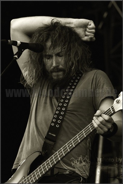 Selbst wenn man einfach nur in der Gegend herumsteht, ist man nach wenigen Minuten schweißnass. Während der meteorologische Wind sich nicht spüren lässt, fegt mit MASTODON aber frische Luft in musikalischer Form über die Bühne, die keineswegs so lahm und überbewertet ist, wie meine beide sonnengeschwächten Kollegen behaupten. Die kaum einzuordnenden proggigen Soundozeane der eigenwillig aussehenden Band sorgen für eine willkommene Abwechslung zwischen allerlei Geknüppel. Schade, dass das nur relativ wenige Menschen vor der Bühne zu schätzen wissen. [yb]