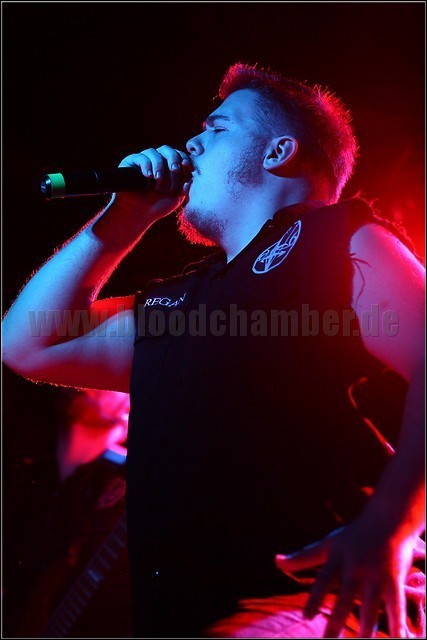 Nach dem Auftritt von BURNING THE MASSES werde ich ungefähr 5 mal gefragt, wer denn das überhaupt gewesen sei. Keiner scheint die Amerikaner mit dem Hang zu Geballer und Frickelsoli zu kennen, und doch sind viele der Anwesenden positiv überrascht und so kann die Band beschwingt die Bühne verlassen. Vorher haben sie schätzungsweise eine halbe Stunde richtig gut Alarm gemacht, eine feine Mischung aus Blast, Groove und Gefrickel, dazu Sänger Cameron "Big Chocolate" Argon und sein mächtiges Organ. Die Skalendrescherei kann einem manchmal auf die Nerven gehen, aber bei BURNING THE MASSES geht das irgendwie in Ordnung. Die Jungs sind fit an ihren Instrumenten und sehen dabei aus, als kämen sie gerade von ihrer eigenen Jugendweihe. Eine Band mit Potenzial, live auf jeden Fall ne Bank, und horcht auf, sogar der Sound war spitzenmäßig, und das ist nicht immer so im Conne Island, ich erinnere ungerne an den grottigen Klang bei HATE ETERNAL. ''Big Chocolate'' lässt es sich nicht nehmen, kurz die Bühne zu verlassen, um direkten Augenkontakt mit den Fans aufzunehmen und sie natürlich tierisch anzublöken! Irgendwann ist dann aber auch Schluss, der metallische Durst will ja auch gestillt werden.