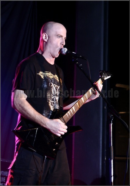 Den Opener geben damit REVOCATION aus Boston. Pünktlich um 20:30 entert das Trio die Bühne, um ihre Interpretation des verfrickelten Death-Metals, der sich im Thrash-Kostüm in die Gehörgänge brennen soll, zum Besten zu geben. Leider schwindet meine Vorfreude jedoch schon bald und verwandelt sich in Ernüchterung. Was den Jungs auf Platte gelingt, scheint sich nicht auf die Bühnenbretter nageln zu lassen, denn irgendwie kann man sich nicht dem Eindruck entziehen, dass ein zweiter Gitarrist dem Ganzen etwas mehr Fülle verleihen würde. Gitarrist und Sänger David Davidson beweist zwar eindrucksvoll seine spielerischen Fähigkeiten, doch können seine Soli dem Ganzen keine runde Form geben. Auch Bassist Anthony Buda lässt sich von der Nervosität anstecken und räumt erst einmal den Mikroständer von der Bühne. Nichtsdestotrotz können sich die Jungs aber steigern. Mit ''Age of Iniquity“, ''Unattained“ und dem exzellenten ''Empire of the Obscene“ kehrt die Sicherheit zurück und die Jungs können dem einen oder anderen Fan doch noch ein zufriedenes Grinsen ins Gesicht meißeln. Mit Applaus honorieren diese dann auch den recht kurzen Auftritt. Ingesamt ein zerfahrener Gig, der am Ende jedoch versöhnen und eine Vorstellung vom Potential der Band vermitteln konnte.[mr]