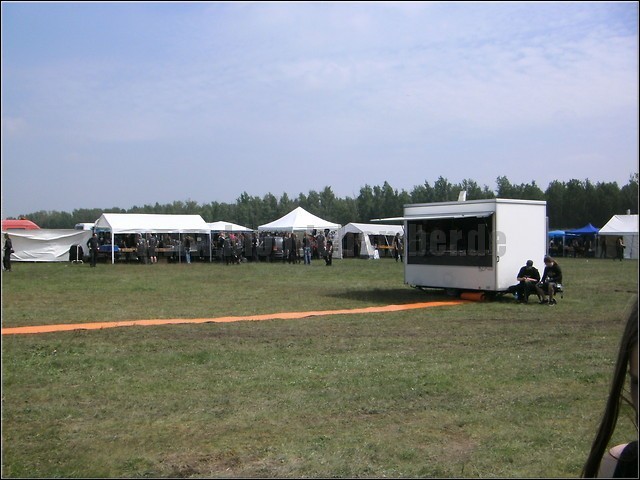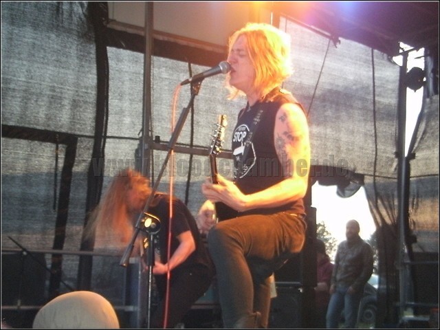 Bevor ich auf die Bands eingehe, gibts aber erst ein paar allgemeine Facts über das diesjährige FOA. Zunächst müssen die Veranstalter das Publikum in diesem Jahr auf einem neuen Gelände begrüßen, und zwar auf dem Segelflugplatz beim kleinen, mehr oder minder beschaulichen Ort Renneritz, ca. 10 km entfernt von Bitterfeld. Viele (ebenso ich) finden Gelände auf Anhieb nicht, unter anderem auch deswegen, da irgendwelche Spaßbolde offensichtlich die wegweisenden Schilder geklaut haben, wie mir später mitgeteilt wird. Wirklich witzig, ihr Affen! An sonsten kann sich der Fan aber weiterhin neben den Bands über kleine Getränkepreise, tolle Merch- und Fressstände, sowie die gut organisierte Arbeit des Teams freuen. Ein kleiner Tropfen Wehmut: da man dieses Jahr die Zelte auf einem anderen Gelände aufgeschlagen hat, gibt es hier leider keine Präsenz des örtlichen Bikerclubs, in dessen Clubheim man sonst immer aufs Beste mit Hartalkohol versorgt wurde. Der hauseigene Schnapsstand der Orga macht das aber weitestgehend Wett. Wettertechnisch kann sich denke ich bei andauerndem strahlendem Sonnenschein (abgesehen vom verregneten Abreisetag) auch niemand beschweren. Was will man also mehr? Natürlich Musik. Die Bands. Und die gibt' s jetzt!