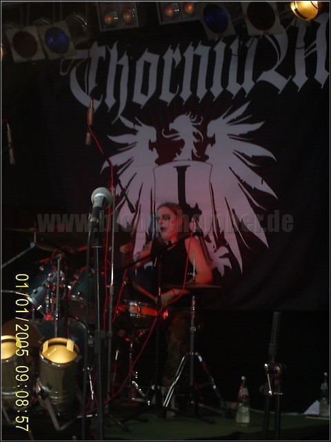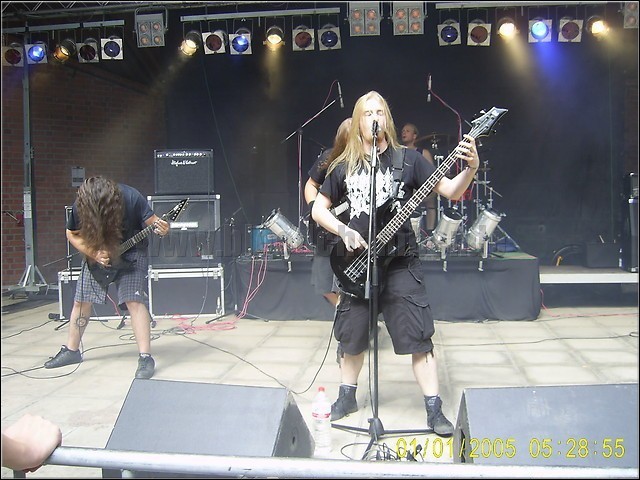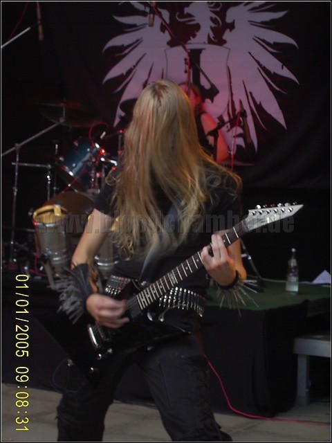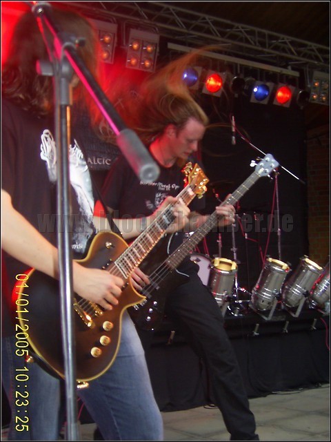 Nun eine Band, die heute polarisiert. Die einen sagen, es sei ein wahnsinnig guter Auftritt; die anderen hingegen finden ihn lächerlich. Ich gehöre zu der zweiten Gattung. ADORNED BROOD, zweifellos eine der ersten deutschen und früher auch besten deutschen Pagan-Bands bitten zum Tanze. Teutobot Frost und seine Mannen und Frau fangen auch gleich ordentlich an. Die Querflöte bedient zwar nicht Ingeborg-Anna, da sie gerade Mutter geworden ist, aber die Ersatzflötistin steht ihr in nichts nach, soweit ich das mitbekomme. Der Sound ist im Vergleich zu Lividity eine Katastrophe, aber vor der Bühne ist die Hölle los. Gleich als zweiten Song wählen ADORNED BROOD das Cover von The Bots „Sieben Tage“. Nun, ich mag den Song wirklich gerne und es ist ein Stimmungslied durch und durch, aber muss eine etaiblierte und erfahrene Band wie ADORNED BROOD gleich zum Anfang auf Cover-Stücke zurückgreifen, um Stimmung zu machen? Sie haben doch wirklich genug eigene Stücke, die die Fans mitreißen können. So ziehe ich enttäuscht von der Bühne ab, die Treppen hinauf zum Bierwagen, um mir von dort den Gig weiter anzusehen. Dort stehen die auch die Jungs von Toxocara, die meinen Eindruck bestätigen: „What a crap!“. Sogar einige Die-Hard-Pagan-Fans, die noch nicht so dermaßen vom Alkohol gekennzeichnet sind, verdrehen die Augen. Vor der Bühne werden ADORNED BROOD trotzdem gefeiert. Für mich befinden sie sich auf dem absteigenden Ast und andere Bands, wie Gernotshagen, Menhir, Equilibrium haben den Grevenbroichern eh schon lange den Rang abgelaufen.