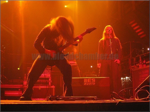Die anschließende Pause dauerte dieses Mal ein wenig länger, aber fast exakt 22:00 Uhr betrat der Schicksalsberg in Form von fünf kräftig gewachsenen Burschen die Bühne und sofort wurde klar, weshalb die meisten der Anwesenden hierher angereist waren. Ich empfand es fast schon ein wenig unfair, dass zuvor kaum jemand seinen Arsch bewegte, während nun kaum jemand denselbigen still halten konnte. Aber diese Fanschar ist wohl der Lohn von langen Jahren harter Arbeit, die die Jungs von AMON AMARTH hinter sich haben. Aber machen wir uns nichts vor, sie haben es halt einfach drauf, unsere schwedischen Riffmeister. Aggressiv, melodisch, majestätisch und vor allem mitreißend sind ihre Songs, die dank guter Auswahl die oftmals kritisierte Langsamkeit mit schnelleren Krachern ausgleichen konnte. Die anderthalb Stunden reguläre Spielzeit + zwei Zugaben vergingen quasi wie im Flug und zu bemängeln gab es eigentlich nur Kleinigkeiten. Zum einen war der Sound zu Beginn ein wenig zu basslastig, aber gegen Ende fiel dies kaum noch ins Gewicht. Zum anderen trübten die in meinen Augen schwächeren Songs vom Crusher-Album ein wenig den Spass, aber dafür konnte man sich währenddessen sehr gut für die darauffolgenden Kracher wie „Fate Of Norns“ oder „Death In Fire“ erholen. Dies ist in meinem fortschrittlichen Alter leider auch traurige Notwendigkeit, denn genauso wie das Deo meines Nachbarn komplett versagte (falls er je eines benutzt hat), musste ich gegen Ende zähneknirschend feststellen, dass der Geist zwar willig, das Fleisch aber alles andere als fähig war, meinen angestrebten Kopf- und Nackenbewegungen zu folgen. Wenn man mich jetzt nicht als kompletten Schlaffi bezeichnet, so ist das doch nur ein positives Zeichen der Live-Qualitäten einer Band.