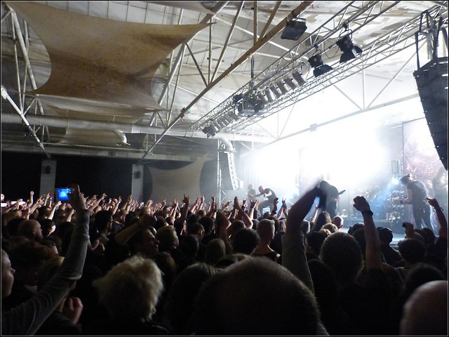 Zum Tagesabschluss bleibt es anders, für THE OCEAN ist das allerdings nichts Neues. Als erste von zwei Bands am ganzen Wochenende bedienen die Berliner sich nicht der beeindruckenden, im Bühnenhintergrund die gewohnten Backdrops ersetzenden LED-Leinwand, sondern setzen auf eine weiße Leinwand, auf der wasserlastige Projektionen die maritime Musik untermalen sollen. Trotz anfänglicher Technikprobleme – selten zuvor habe ich jemanden ähnlich vehement weniger Monitorsound fordern hören – entpuppen THE OCEAN sich schnell als die schlüssigste und ausgereifteste Band des Tages. Die Wandlungsfähigkeit vom MeeresMASTODON zum atmosphärischen Progträumer wirkt jederzeit stimmig und scheint die Musiker binnen Sekunden bis ins Mark zu durchdringen. Ins Auge sticht, dass mutmaßlich kaum eine ähnlich anspruchsvolle Band ein dermaßen auf das Wesentliche reduzierte Schlagzeug im Einsatz haben dürfte. Während Bassist Louis mit großen Rockstarposen auf sich aufmerksam macht und Fronter Loïc leidet, lebt und tut und macht, sind Robin und Jonathan mir persönlich eine Spur zu arg auf ihre Gitarren fixiert. Ebenfalls schade ist, dass die Band so in ihrer Atmosphäre gefangen scheint - oder diesen Eindruck zumindest nicht trüben möchte -, dass kaum die Gelegenheit zur direkten Kommunikation mit dem Publikum ergriffen wird. Im Vergleich zur Qualität der angebotenen Musik sind das aber Nebensächlichkeiten, die nicht sonderlich ins Gewicht fallen. Großer Abschluss des zweiten Tages, zumal die Band auch anderweitig beeindruckt, denn alle 12 verschiedenen (!) THE OCEAN-Shirts am Merchstand sehen ausnahmslos spitze aus.