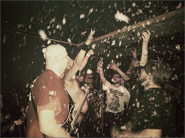 Nun aber zwängen sich die EXCREMENTORY GRINDFUCKERS in die enge Bühnenecke. Mitgebracht haben sie Schnee. Oder zumindest schneeartigen Schaum. Jedenfalls genug, um in dem kleinen Raum ausreichend Vorweihnachtsatmosphäre zu schaffen. Santa Kai und Santa Rob haben aber nicht nur Keimzellen in ihren Säcken, sondern auch ne Menge Geschenke für das Publikum. Gutgelaunt und grundsympathisch feuern sie ihre angejuxten Grindkanonen in die Menge, die glücklicherweise den Großteil der Vernunft vor der Ladentür geparkt hat. Ja, um den Humor der Grindfuckers zu mögen, braucht es durchaus die richtige Zeit und die richtige Stimmung. Glücklicherweise kommt heute aber auch noch der richtige Ort hinzu. Ausgelassen und schambefreit fliegen Arme und Beine durch die Luft, zu Rhythmen, bei denen sich selbst unsere Eltern nicht auf die Tanzfläche getraut hätten. Der vernunftbemühte, seinen Kindern bestmöglichst als Vorbild dienende Vater in mir ist froh, hier und jetzt ohne Kinder unterwegs zu sein und sich auch mal zum Affen machen zu können. Der Mix aus gegrindcoverten Gassenhauern und eigenen Mitgrölhits steckt an. Trotz gefühlter fünf Quadratzentimer Raum ist immer noch Platz für spontane Walls of Death. Die Band will man nach einer guten Stunde Ekstase einfach nicht mehr gehen lassen. Doch da zeigt sich dann die ganze Perfidität des hinterlistigen Schaum-Tricks: Flink flutscht der Fünfer durch die Finger der feuchtgeschwitzten Four-Rooms-Besetzer. Natürlich nicht, ohne vorher noch eine ausgiebige Zugabe zu kredenzen. Danke.