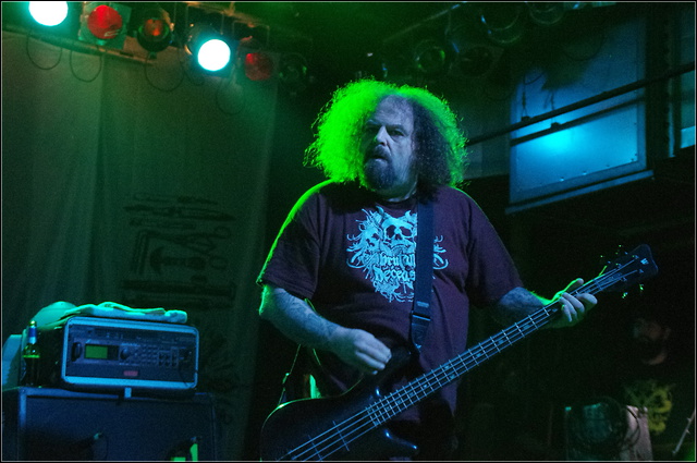 Und der steht trotz pompöser Lichtshow schon nach wenigen Minuten auf der Bühne. CARCASS machen den Abend komplett und legen noch ein paar Jährchen musikalische Lebenserfahrung oben drauf. Dem Gefühl nach sind die meisten Fans wegen den Engländern hier. Zumindest überwiegen deutlich die CARCASS T-Shirts und Pullover. Schon gleich nach dem Intro entschuldigt sich dann Jeff Walker für seine Erkältung, nimmt es aber als guten Grund, um seine Fans zu animieren. Wenn er auf der Bühne stehen kann, dann können wir auch Party machen. In ihrer Bandgeschichte haben CARCASS von Grindcore, über Death Metal bis hin zu rockigem Melodic Death Metal schon alles gespielt, und dementsprechend ist die Auswahl am heutigen Abend ziemlich groß. Nach dem Intro folgt zuerst einmal „Unfit For Human Consumption“ aus ihrem Comeback-Album „Surgical Steel“. Und auch im weiteren Verlauf des Albums geht es hauptsächlich in diesem Stil weiter. Von der großen Auswahl werden also nur die neueren Songs runtergezockt, schade eigentlich. Dennoch, harter Metal trifft auf Rock'n'Roll und sorgt somit für viel Stimmung im immer noch proppenvollen Backstage. Die Bühnenshow von CARCASS ist weder verrückt wie bei NAPALM DEATH, noch distanziert wie bei OBITUARY. Eher Lässig und abgebrüht stehen die vier Musiker auf der Bühne und verausgaben sich für ganze 80 Minuten. Ehrlicherweise muss ich gestehen, dass CARCASS nicht meine Lieblingsband am heutigen Abend ist. Vielleicht liegt es ja daran, oder auch am angeschlagenen Frontmann, aber so richtig will bei mir der Funke nicht überspringen. Klar, musikalische gibt es gerade ein Feuerwerk der ersten Güte zu bestaunen, doch trotzdem hält sich meine Euphorie in Grenzen. Mit der Meinung bin ich aber sicherlich einer der wenigen, wenn ich mir die zahlreichen Crowdsurfer vor der Bühne anschaue.